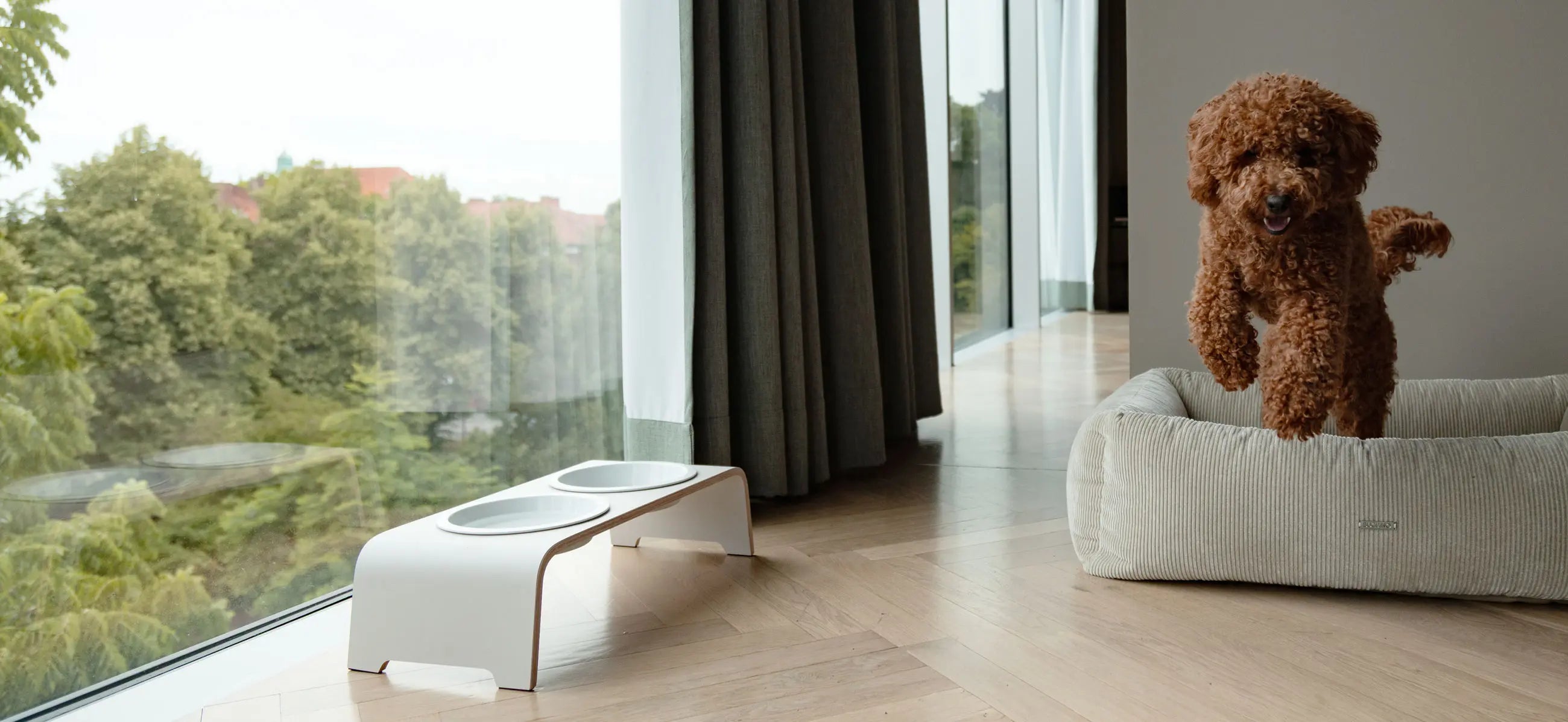 Die dogBar® wurde als hochwertiges Möbelstück für Hunde entwickelt. Die Form entsteht aus formverleimtem Schichtholz – einer Technik, die auch im klassischen Möbeldesign eingesetzt wird. Die klaren Linien und die reduzierte Formensprache fügen sich harmonisch in moderne Wohnräume ein.